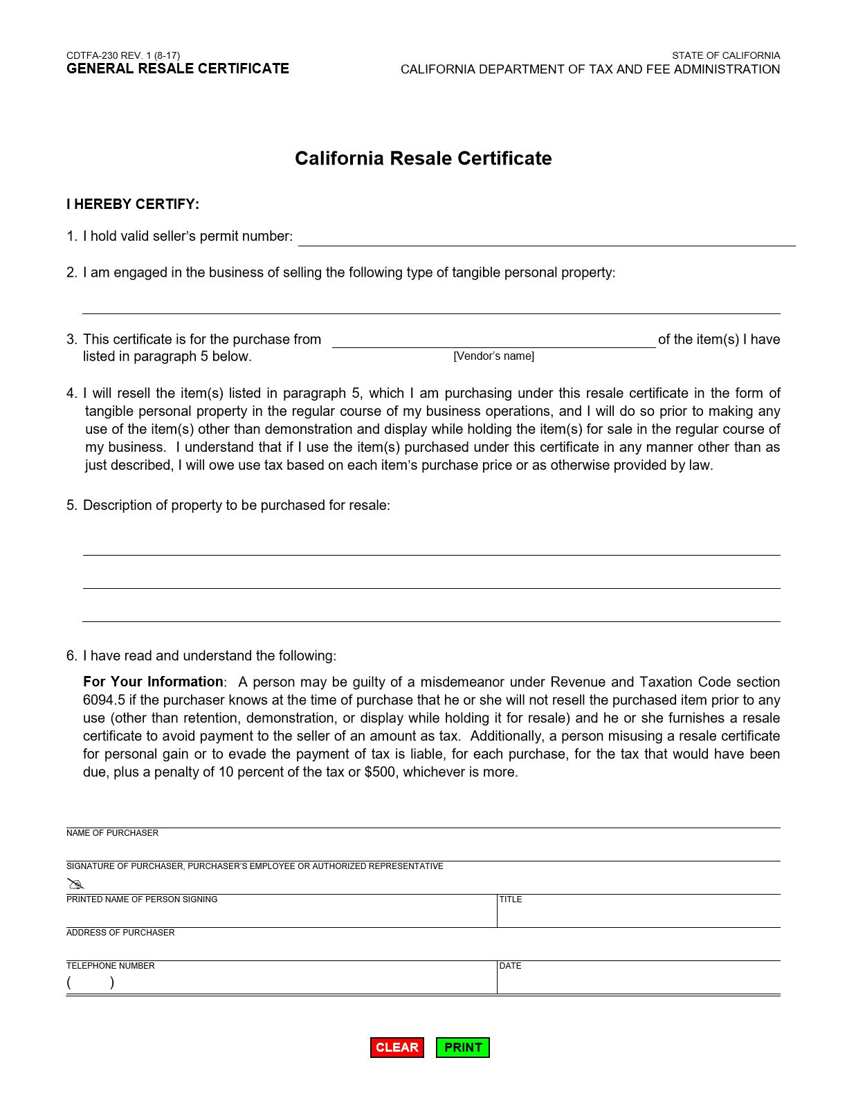 CA RESALE CERTIFICATE